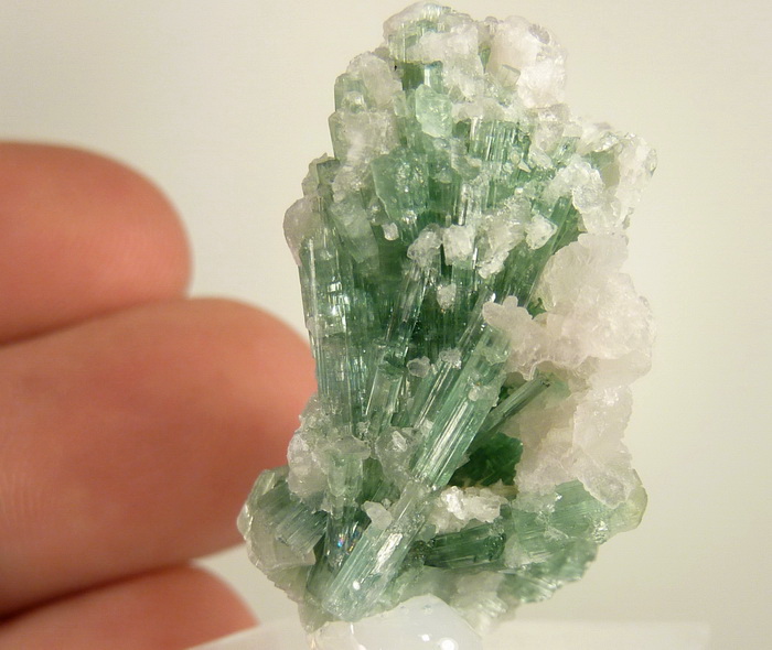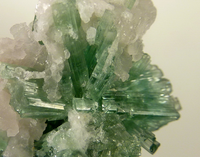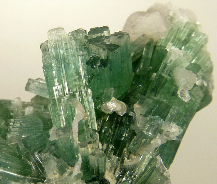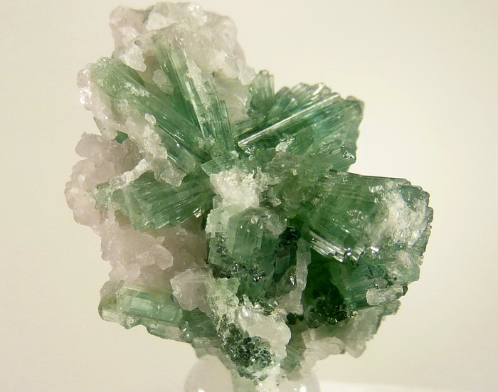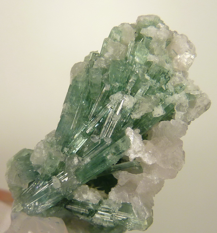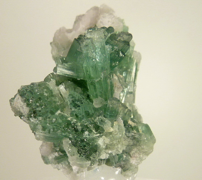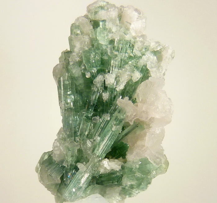 Fantastyczny zrost intesywnie błyszczących kryształów zielonego turmalinu - werdelitu o pięknej zielonej barwie.