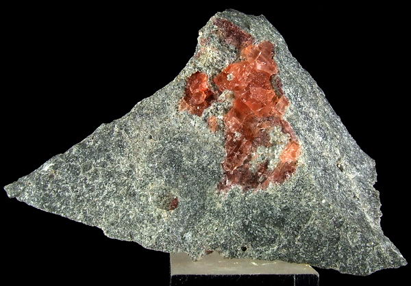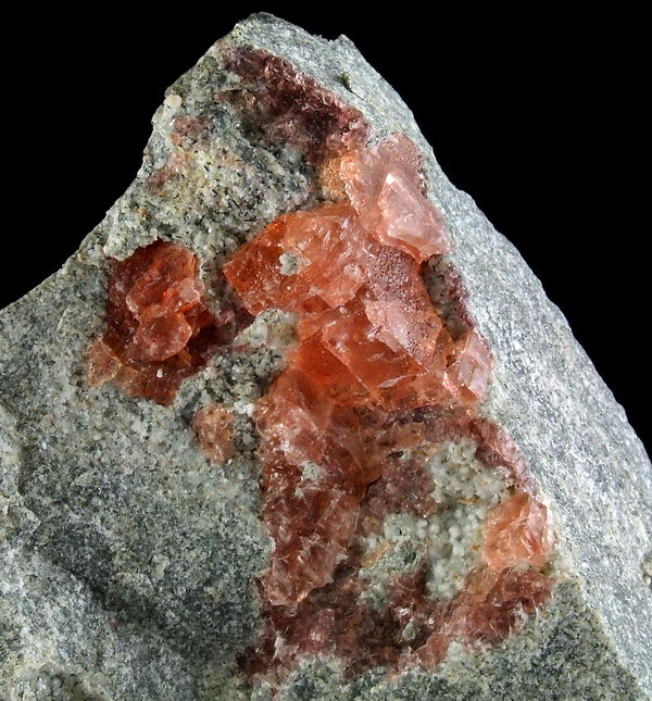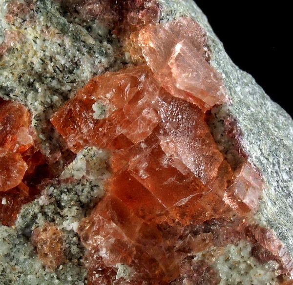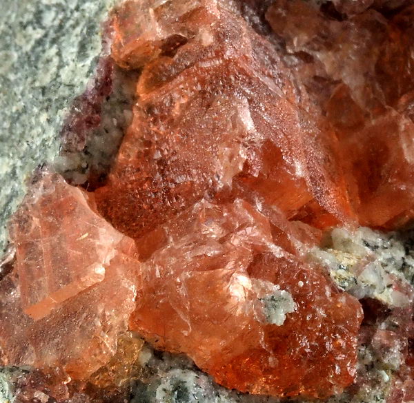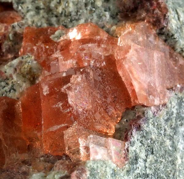 Czerwone, przezroczyste skupienie bardzo rzadkiego minerału villiaumitu na matrixie.
