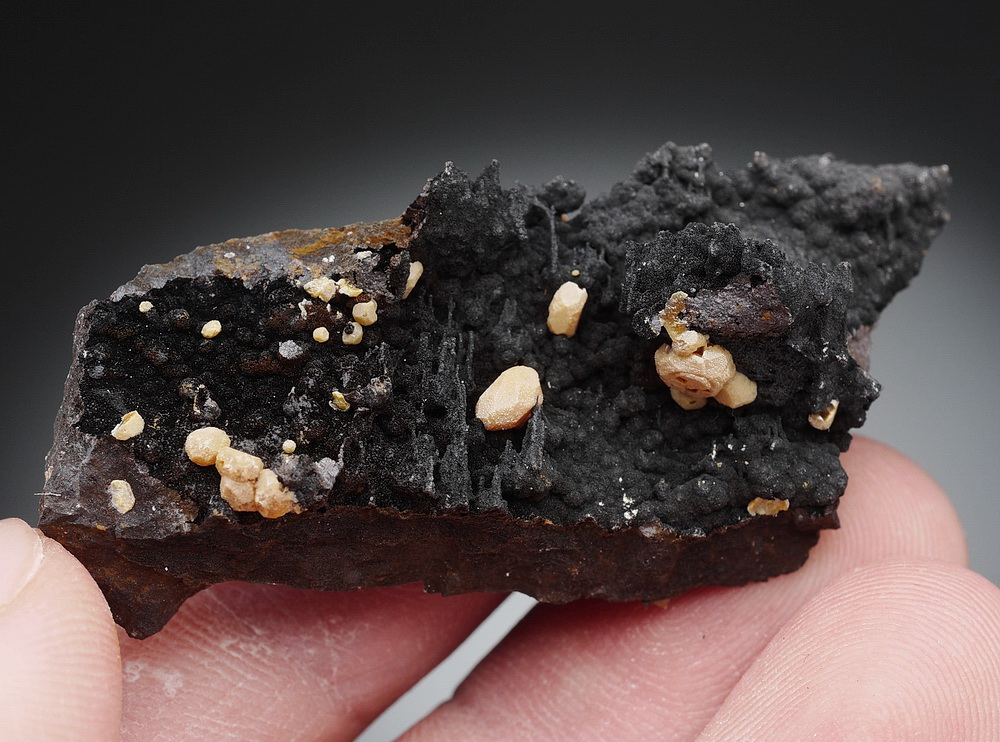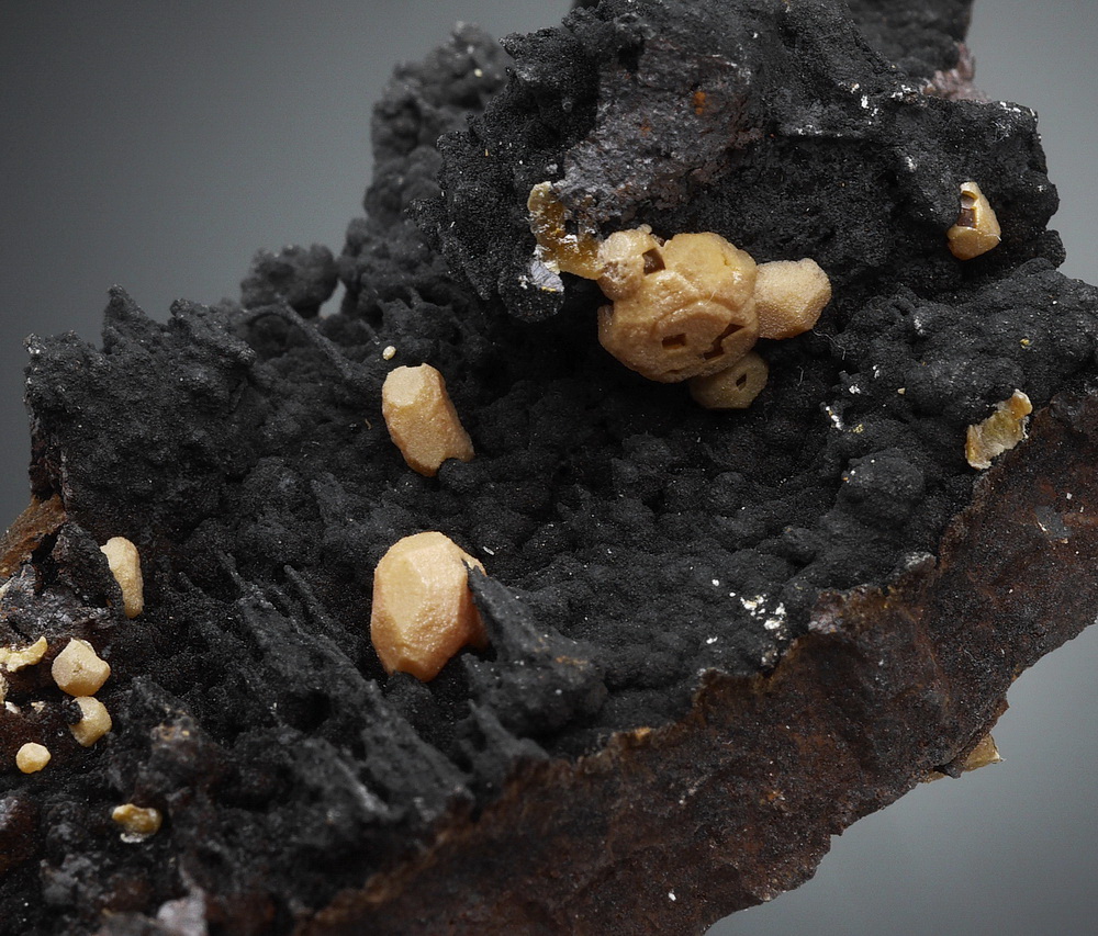 Żółte kryształy wanadynitu na goethycie - pseudostalaktyty.