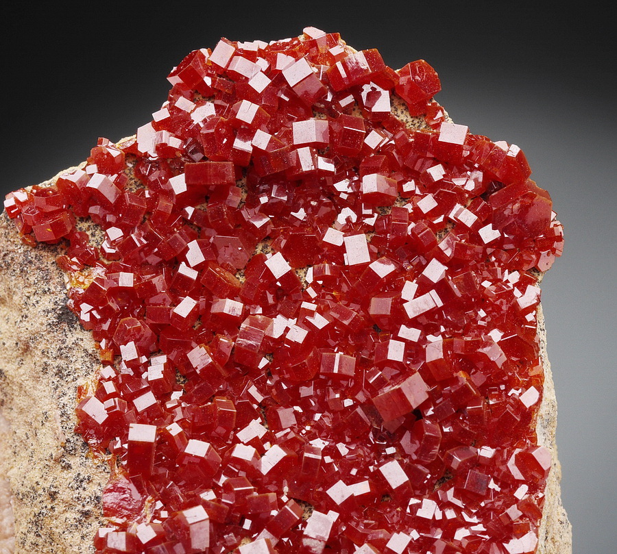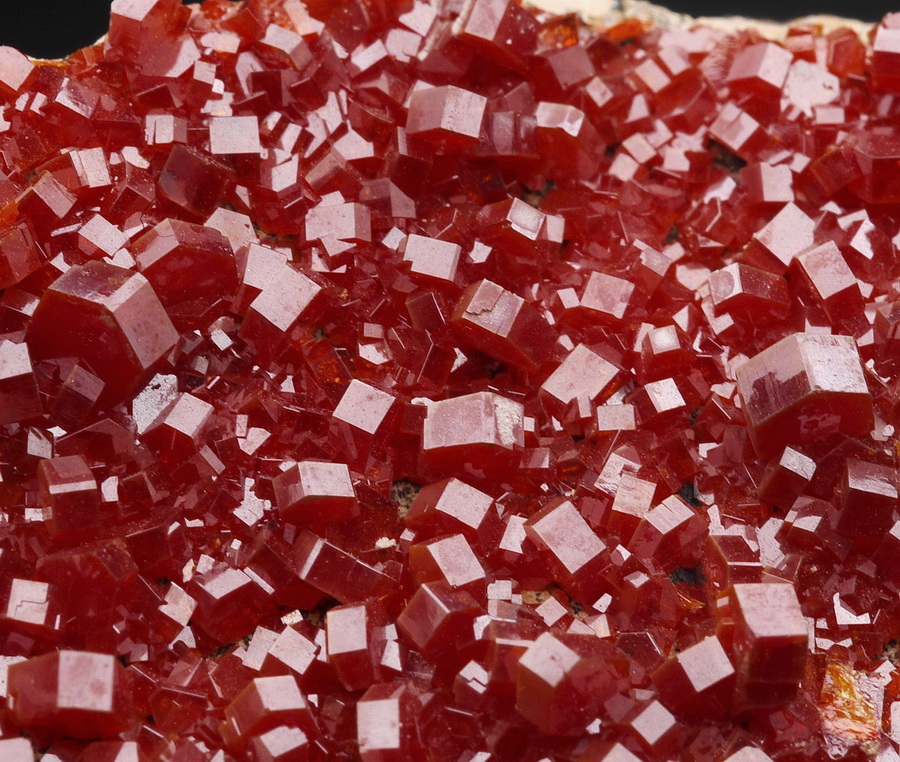 Dobrze wykształcone i błyszczące kryształy wanadynitu osadzone na matrixie.
