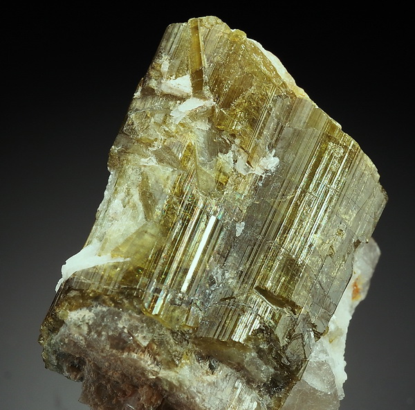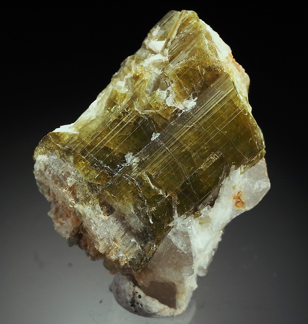 Błyszczący kryształ zielonego turmalinu (elbait - odm. werdelit / verdelit ) osadzony w kwarcu.