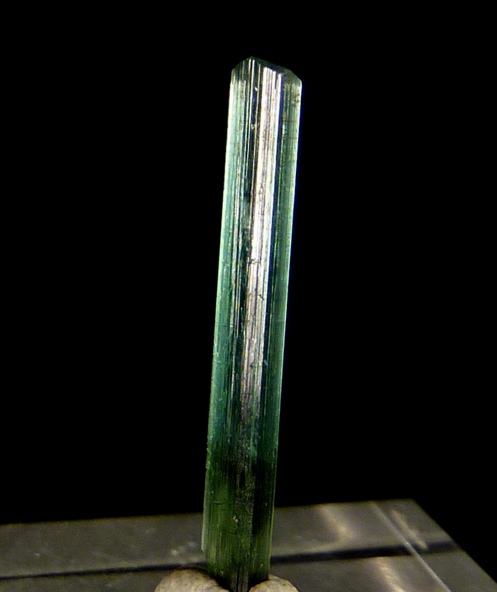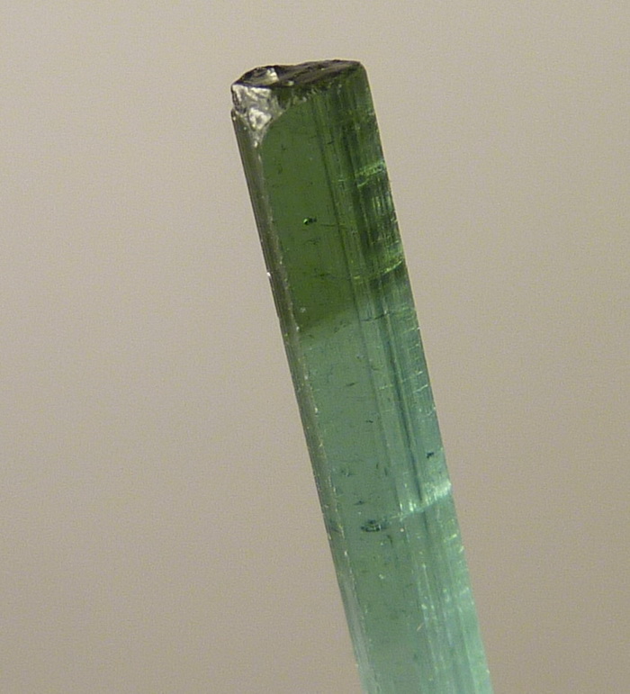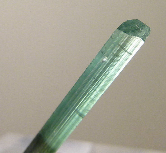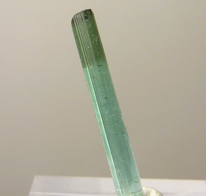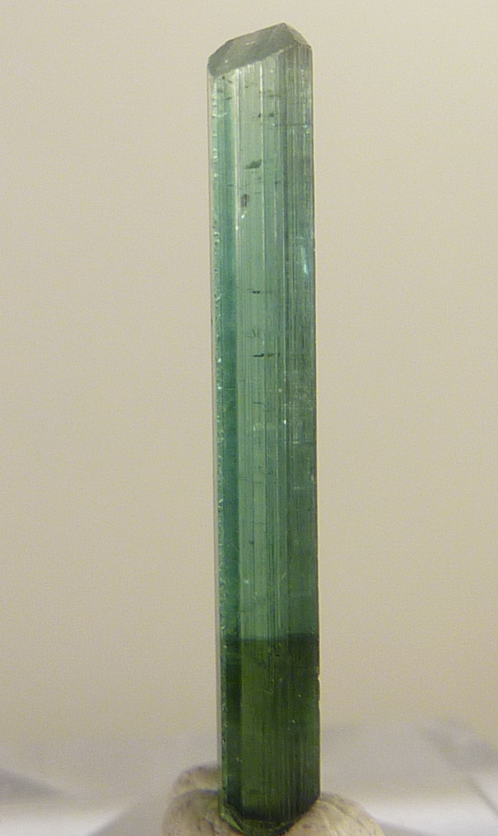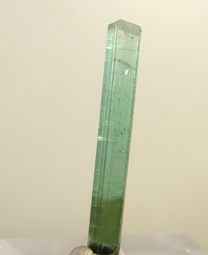 Pięknie wykształcony przezroczysty kryształ zielonej odmiany turmalinu - werdelitu, o ładnej intensywnej barwie (na górze turkusowy, w dolnej części przechodzi w zielony).